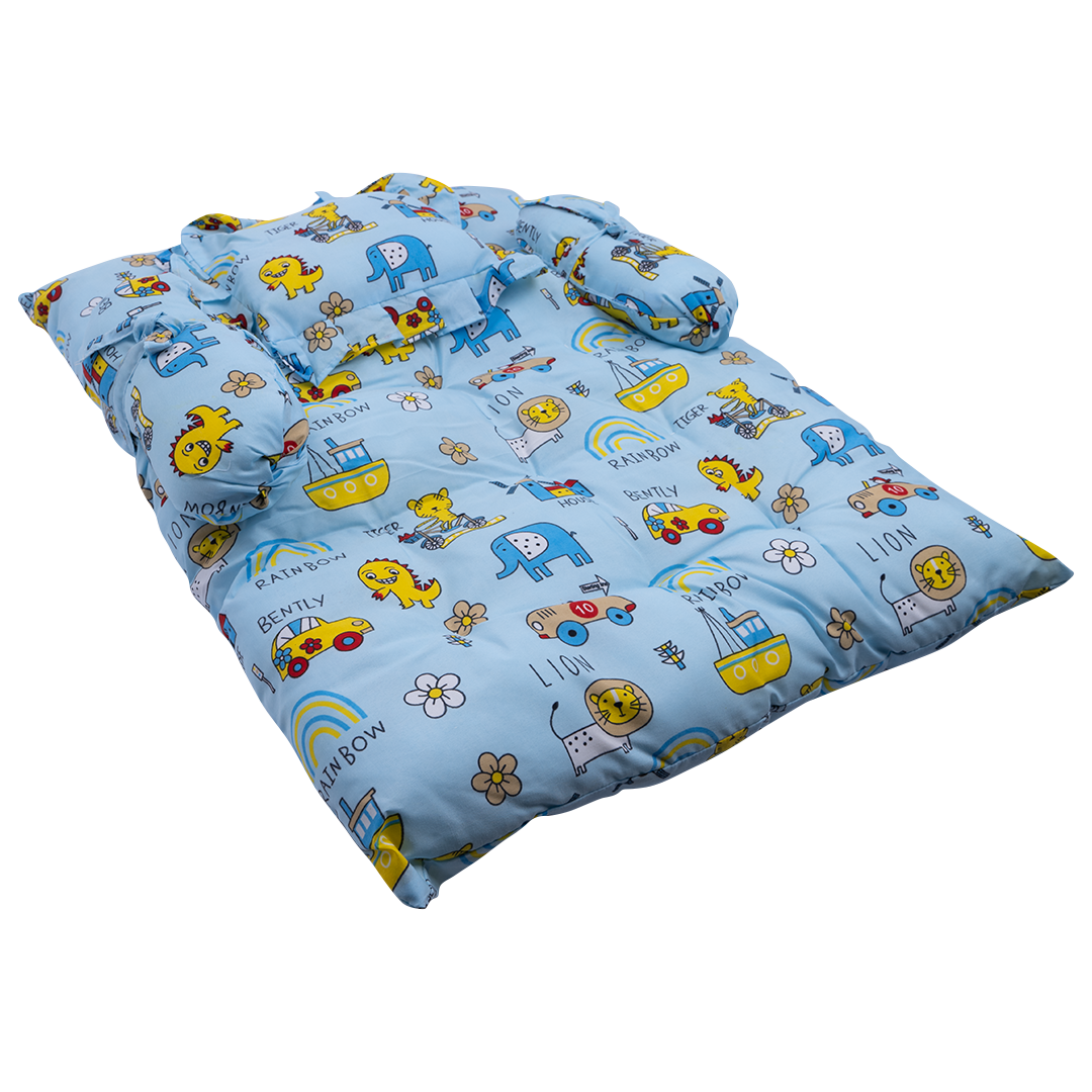 An foldable well cushioned mattress with one neck pillow and side pillows for comfortable and long lasting sleep. Portable and carried out anywhere.