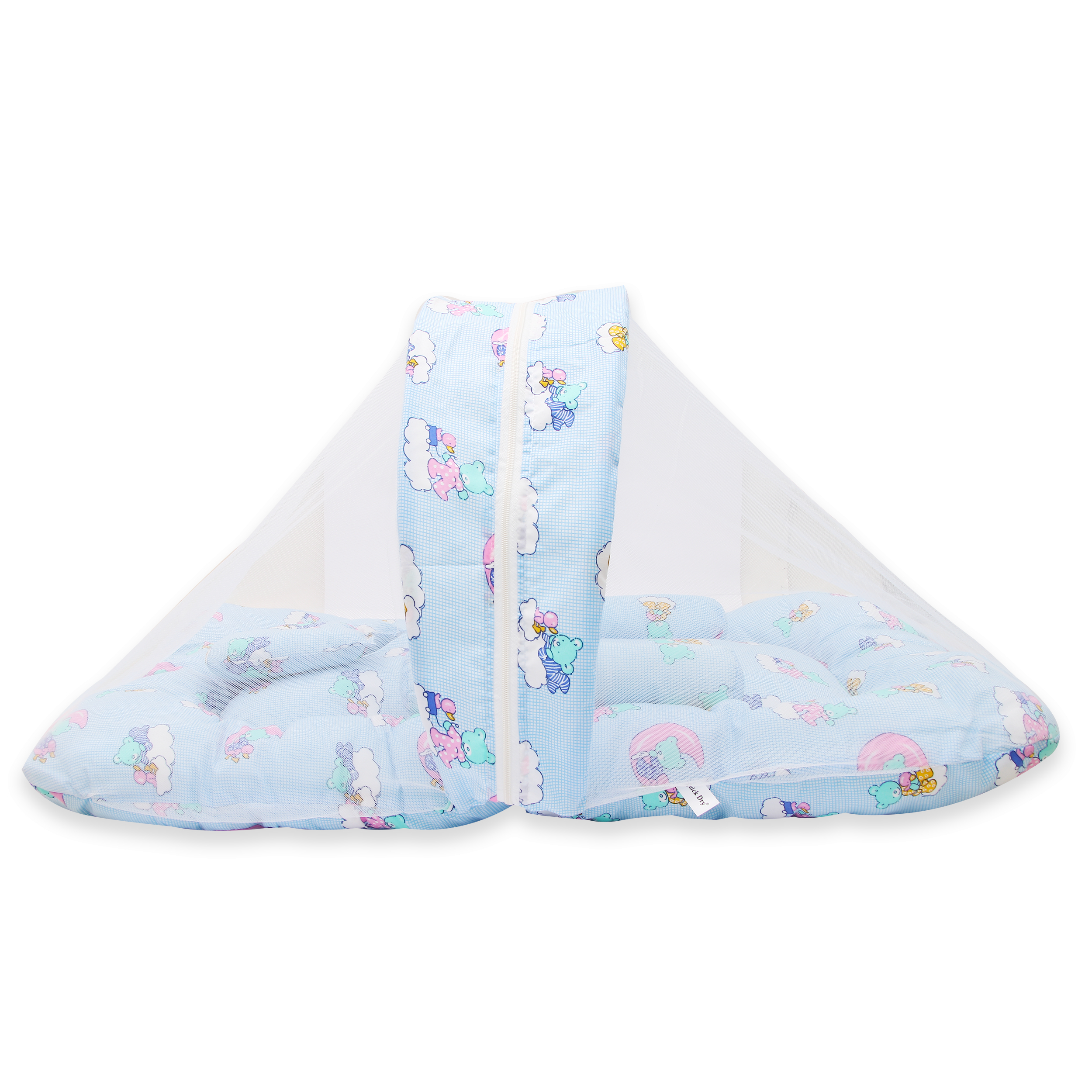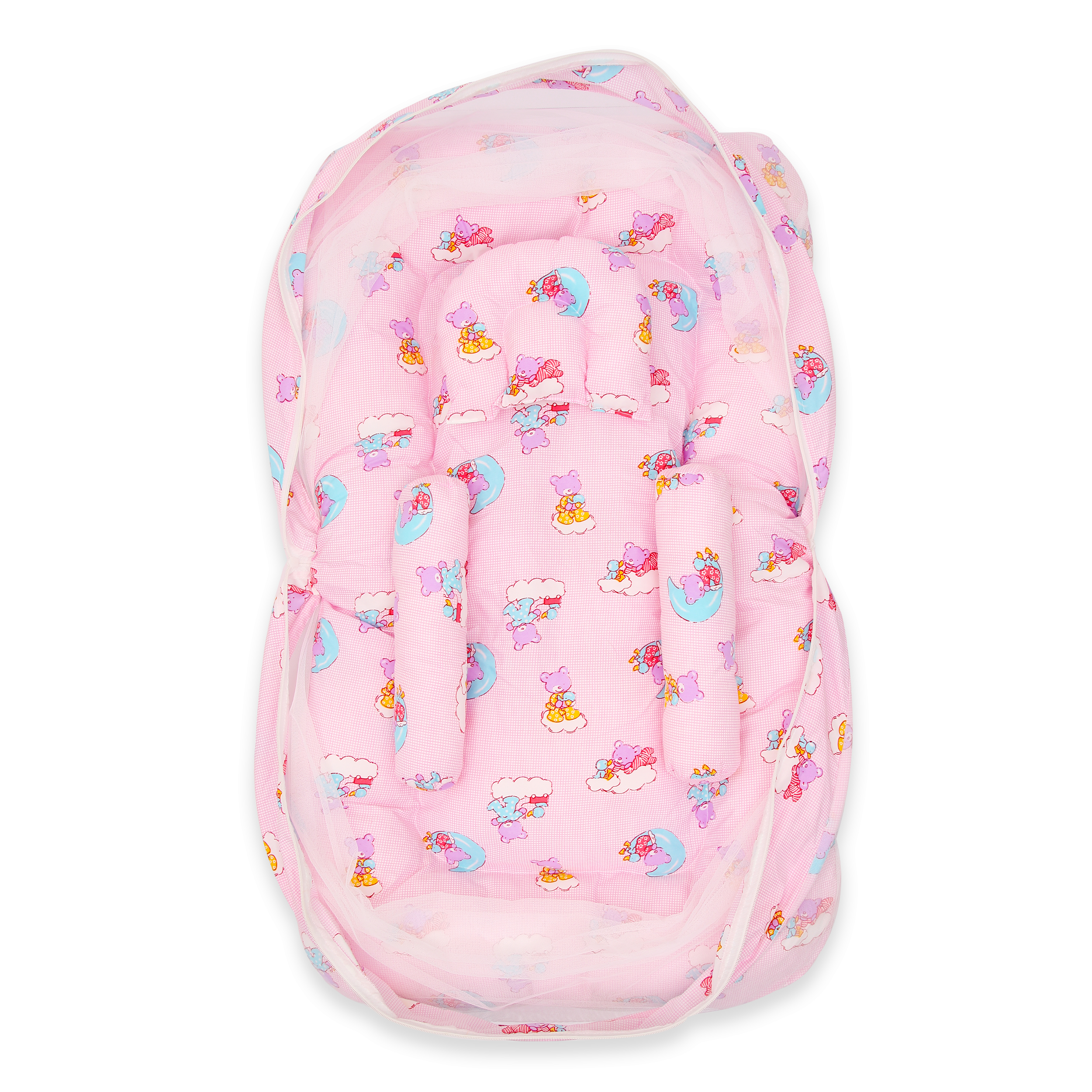 Note: This product consists of a small bed with an attached mosquito net, a small head pillow, and two side pillows.
